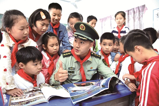 圖為武警官兵在給小學(xué)生講述戰(zhàn)斗故事。