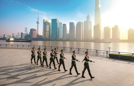 迎著晨光,武警上??傟爤?zhí)勤第四支隊執(zhí)勤十中隊巡邏官兵走上戰(zhàn)位,一路經(jīng)過人民公園、人民廣場,來到南京路。