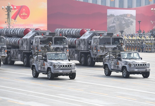 2019年10月1日上午,慶祝中華人民共和國(guó)成立70周年大會(huì)在北京天安門廣場(chǎng)隆重舉行。圖為接受檢閱的地空導(dǎo)彈第1方隊(duì)。新華社記者 張晨霖 攝