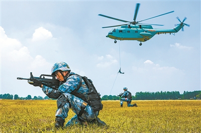 懸停、開艙、滑降……戰(zhàn)機(jī)到達(dá)作戰(zhàn)地域上空后,突擊隊(duì)員迅速出艙滑降,動(dòng)作一氣呵成,猶如神兵天降。落地后,在突擊組組長指揮下,隊(duì)員們密切協(xié)同,以迅雷不及掩耳之勢(shì)對(duì)“敵”發(fā)起攻擊。