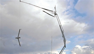 “天鉤”回收。這種方式同樣是用于中小型固定翼無人機的降落。這種降落方式可視為對撞網回收方式的高度簡化,即將攔阻網簡化為一根繩索,將數(shù)個支架簡化為一根高強度的支柱。