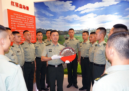 圖為“紅一連”指導(dǎo)員鄭紀(jì)文為戰(zhàn)士們講解連隊“紅菜盤”的故事。張永進(jìn) 攝