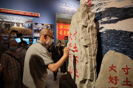 展柜里,有太多細(xì)節(jié)令人感動(dòng):王繼才去世當(dāng)日,在開(kāi)山島升起的五星紅旗;新時(shí)代衛(wèi)國(guó)戍邊英雄群體的遺物,無(wú)聲地述說(shuō)著“大好河山、寸土不讓”的鏗鏘誓言;2020年年初,軍隊(duì)支援湖北醫(yī)療隊(duì)省婦幼保健院光谷院區(qū)“黨員突擊隊(duì)”旗上密密麻麻的簽名;火箭軍援鄂醫(yī)療隊(duì)員集體簽名的防護(hù)服,在展柜燈光的映襯下閃閃發(fā)亮……