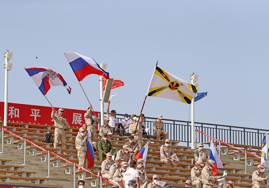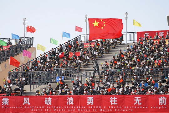 旌旗迎風(fēng)招展,和平友誼同筑。白俄羅斯、埃及、俄羅斯、烏茲別克斯坦、委內(nèi)瑞拉、越南參賽代表隊(duì)依次入場。當(dāng)一面面不同國家的國旗通過觀禮臺時,現(xiàn)場官兵熱烈鼓掌,對遠(yuǎn)道而來的參賽隊(duì)員表示歡迎。東道主中國參賽代表隊(duì)最后一個入場,參賽隊(duì)員們軍容嚴(yán)整、精神抖擻,在五星紅旗引領(lǐng)下通過觀禮臺。