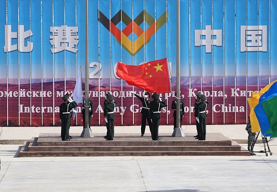 圖為8月22日,“國際軍事比賽-2021”中國庫爾勒賽區(qū)在“蘇沃洛夫突擊”比賽場正式開幕,會場上升起中華人民共和國國旗。張永進(jìn) 攝