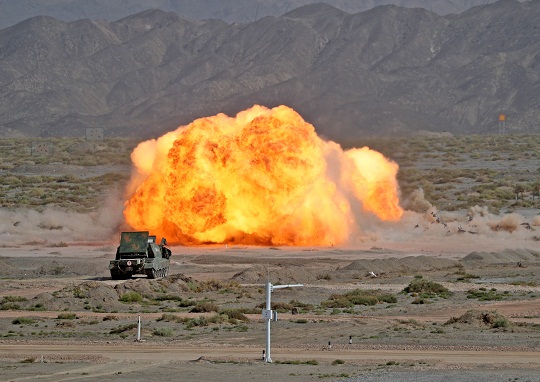 圖為8月22日,“國際軍事比賽-2021”中國庫爾勒賽區(qū)在“蘇沃洛夫突擊”比賽場正式開幕,軍事課目演示中綜合掃雷車進(jìn)行實(shí)彈射擊。羅興倉 攝