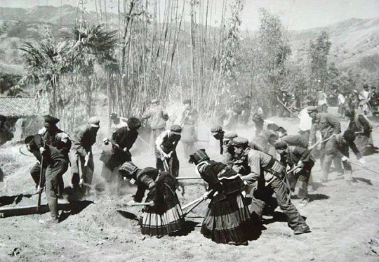 圖為創(chuàng)業(yè)初期,彝漢群眾與航天工作者合力建設(shè)。