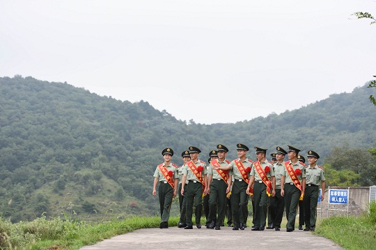 圖為走在昔日的執(zhí)勤路上,即將退伍的6名老兵與留隊(duì)官兵回憶往事。徐偉 攝