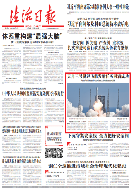 天舟三號貨運飛船入軌后順利完成入軌狀態(tài)設(shè)置,于北京時間9月20日22時08分,采用自主快速交會對接模式成功對接于空間站天和核心艙后向端口,整個過程歷時約6.5小時。天舟三號裝載了航天員生活物資、艙外航天服及出艙消耗品、空間站平臺物資、部分載荷和推進劑等,與天和核心艙及天舟二號組合體完成交會對接后,轉(zhuǎn)入三艙(船)組合體飛行狀態(tài)。