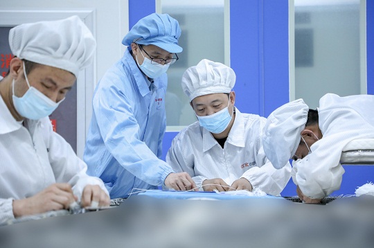 圖為科研團(tuán)隊(duì)在半剛性太陽電池陣生產(chǎn)現(xiàn)場(chǎng)。尹冬寧 攝