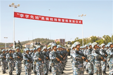 “賡續(xù)光榮傳統(tǒng),爭(zhēng)做‘李學(xué)先班’傳人……”軍委政治工作部為獲得重大榮譽(yù)的英模班排制作的榮譽(yù)柜下發(fā)部隊(duì)后,海軍陸戰(zhàn)隊(duì)某旅第一時(shí)間舉行榮譽(yù)柜發(fā)放儀式,為前身為“李學(xué)先班”的機(jī)步四連二班發(fā)放榮譽(yù)柜。