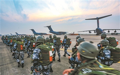拂曉,某軍用機場,數(shù)百名傘兵迅速完成傘具整理和武器裝備披掛,空降空投骨干對重型裝備和空投物資進(jìn)行裝載加固。通過3道檢查線后,傘兵們按照戰(zhàn)斗編組登上戰(zhàn)機。伴著震耳的轟鳴聲,多種機型運輸機編隊依次升空,飛赴預(yù)定空域。
