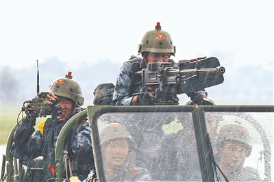 著陸后,官兵駕駛戰(zhàn)車冒雨疾馳。