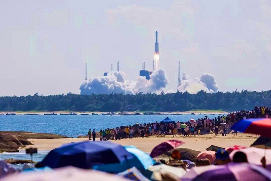 今年9月20日,海灘上、椰林旁、山頂上人山人海。伴隨著一陣山呼海嘯般的巨響,長征七號火箭托舉著天舟三號貨運飛船一飛沖天,中國空間站建設(shè)進(jìn)入承上啟下的關(guān)鍵一步。人們揮舞著國旗、高唱愛國歌曲、眼含熱淚,目送“天舟”奔赴太空。那個下午,騰飛的火箭與碧海藍(lán)天,歡呼的人群與紅色旋律,構(gòu)成了一幅中華民族探索浩瀚宇宙的壯美畫卷。