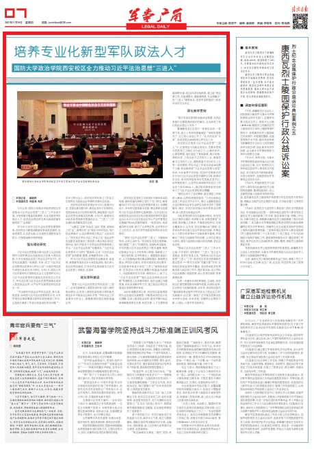 習(xí)近平法治思想蘊(yùn)含著馬克思主義法治原理同中國(guó)軍事法治實(shí)踐相結(jié)合的重大理論創(chuàng)新。中央全面依法治國(guó)工作會(huì)議召開(kāi)后不久,西安校區(qū)就遴選一批教授、專家,成立“習(xí)近平法治思想理論成果學(xué)習(xí)研究小組”,對(duì)相關(guān)理論進(jìn)行深度化體系化學(xué)習(xí)研究。今年1月,國(guó)防大學(xué)習(xí)近平新時(shí)代中國(guó)特色社會(huì)主義思想研究中心習(xí)近平法治思想研究基地在西安校區(qū)正式成立,率先走出將習(xí)近平法治思想貫徹落實(shí)到深入推進(jìn)依法治軍、從嚴(yán)治軍實(shí)踐理論研究的堅(jiān)實(shí)一步。