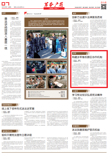 在充分調(diào)研論證的基礎(chǔ)上,空軍召開法律服務工作研討會,著眼軍隊司法行政部門建設、構(gòu)建跨區(qū)協(xié)作機制、維護軍人軍屬合法權(quán)益等進行深入交流,出臺《加強新時代空軍法律服務工作的措施》,分片建立涉軍維權(quán)協(xié)作區(qū),由官兵所在單位提需求,就近指派空軍律師協(xié)助解決。