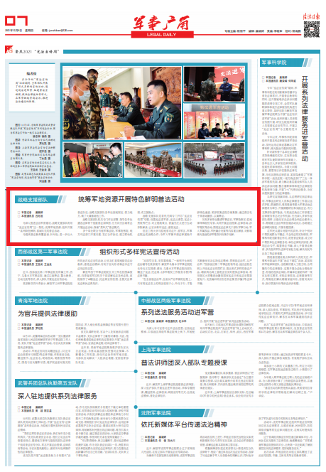 為提高普法教育覆蓋面、針對性,進(jìn)一步壯大普法隊(duì)伍,戰(zhàn)略支援部隊(duì)各單位因地制宜、借力地方,做了大量基礎(chǔ)性工作。