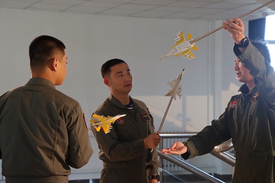 圖為海軍航空大學某基地組織地面演練,這是飛行教官丁陽(右一)正用飛機模型教授學員戰(zhàn)術(shù)動作。趙天淏 攝