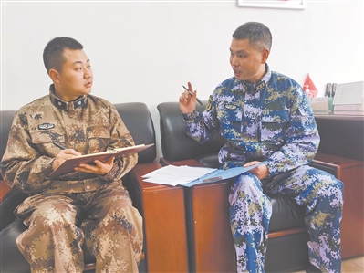 李建國(右)與新入職的文職人員交流談心。蘇彥 攝