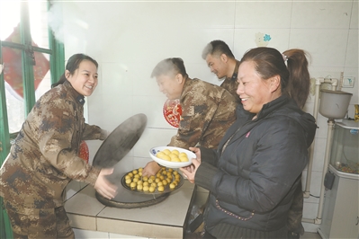 本報(bào)記者范奇飛(左一)與遼寧省營(yíng)口軍分區(qū)幫扶工作隊(duì)在馮家堡村與村民一起蒸黏豆包,寓意生活蒸蒸日上。紀(jì)勝?gòu)?qiáng) 攝