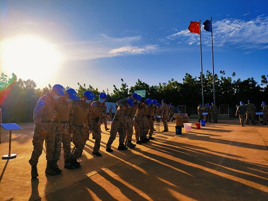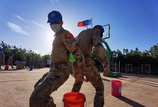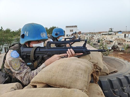 春節(jié)期間,中國第九批赴馬里維和工兵分隊組織了戰(zhàn)備演練。圖為營區(qū)警報響后,快反組迅速領(lǐng)取武器彈藥,占領(lǐng)預(yù)定位置,進入嚴密戒備狀態(tài)。王宏陽 攝