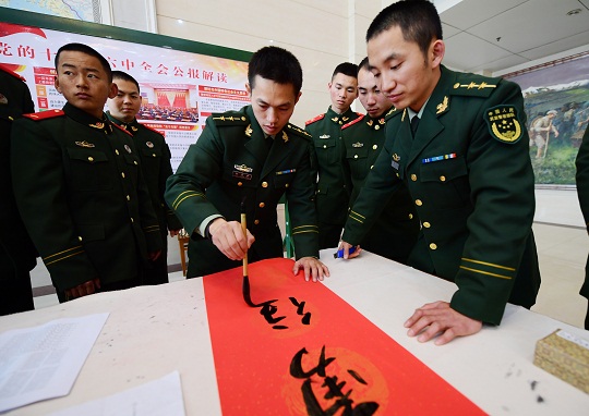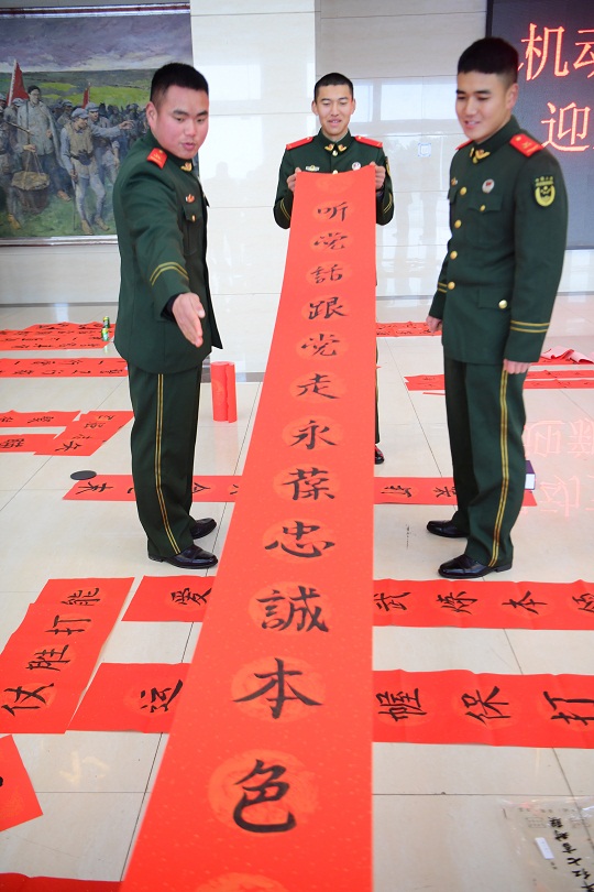 1月27日,武警江西總隊(duì)機(jī)動(dòng)支隊(duì)組織書法愛好者為基層大、中隊(duì)官兵寫春聯(lián)、送福字,喜慶祥和迎春節(jié)。