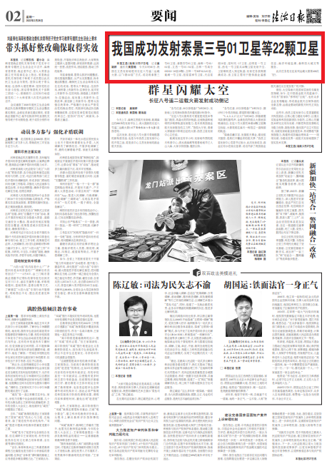 本報(bào)文昌(海南)2月27日電 記者廉穎婷 通訊員黃國暢 今天11時(shí)06分,我國在文昌發(fā)射場使用長征八號(hào)遙二運(yùn)載火箭,以“1箭22星”方式,成功將泰景三號(hào)01衛(wèi)星、泰景四號(hào)01衛(wèi)星、海南一號(hào)01/02星、文昌一號(hào)01/02星、吉林一號(hào)高分03D10-18星(9顆)、吉林一號(hào)MF02A01星、巢湖一號(hào)衛(wèi)星、創(chuàng)星雷神號(hào)衛(wèi)星、天啟星座19星、星時(shí)代-17衛(wèi)星、啟明星一號(hào)衛(wèi)星、西電一號(hào)衛(wèi)星共22顆衛(wèi)星發(fā)射升空。衛(wèi)星順利進(jìn)入預(yù)定軌道,發(fā)射任務(wù)獲得圓滿成功。該衛(wèi)星主要用于提供商業(yè)遙感信息、海洋環(huán)境監(jiān)測、森林防火減災(zāi)等服務(wù)。