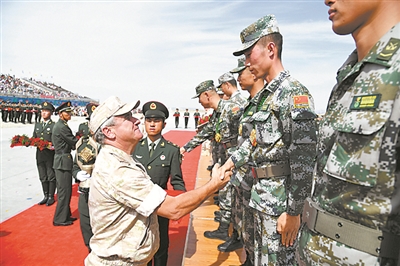 圖③:在“國際軍事比賽-2018”的“蘇沃洛夫突擊”步戰(zhàn)車組項目比賽中,駕駛戰(zhàn)車奪得第一的“雷鋒四班”第16任班長呂玉生登上領(lǐng)獎臺。高翔 錢泓江 攝