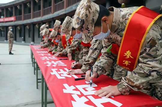 圖為新兵在“筑牢法治之基,開啟軍旅征程”條幅上簽名。