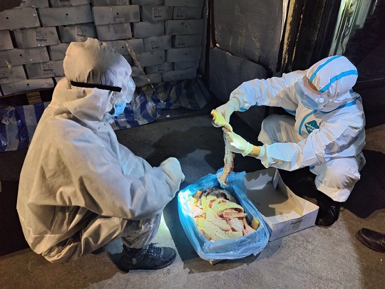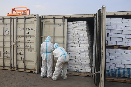 3月13日17時(shí)許,江門(mén)海警局根據(jù)情報(bào)獲悉,在江門(mén)市黃茅海對(duì)開(kāi)海域有走私活動(dòng)。該局立即派遣2艘執(zhí)法艇前往目標(biāo)海域進(jìn)行查緝。當(dāng)日18時(shí)許,該局執(zhí)法員通過(guò)AIS在目標(biāo)海域發(fā)現(xiàn)一艘可疑船只,遂即拉響警報(bào),表明身份,責(zé)令可疑船只立即停船接受檢查。在可疑船只停船后,經(jīng)執(zhí)法員登臨檢查發(fā)現(xiàn),該船舶上裝載有29個(gè)長(zhǎng)20英尺的集裝箱,集裝箱中載有大量?jī)銎?,凍品外包裝上均有明顯的外文標(biāo)識(shí),由于天氣炎熱且船上沒(méi)有任何冷鏈保存裝置,部分凍品已出現(xiàn)腐敗發(fā)臭跡象,隨船未發(fā)現(xiàn)該批凍品任何合法來(lái)源和檢驗(yàn)檢疫證明,執(zhí)法員隨即將涉案船舶及所載凍品依法進(jìn)行查扣。