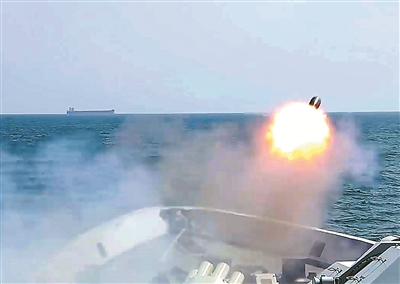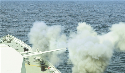 圖①:參訓(xùn)艦艇主炮對海射擊。