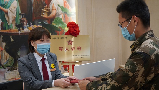 “來到‘軍人驛站’,看到房間內(nèi)干凈整潔的床上用品,一應(yīng)俱全的配套設(shè)施,充滿濃厚軍旅元素的物品飾件,還有熱情周到的服務(wù),我感覺就像住進家里一樣溫馨?!苯?,武警機動某支隊現(xiàn)役警官蔣晨入住江蘇省無錫市某酒店“軍人驛站”后,談及他的感受。