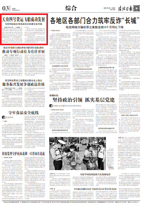 本報北京5月10日訊 記者廉穎婷 據(jù)中國載人航天工程辦公室消息,北京時間5月10日1時56分,搭載天舟四號貨運飛船的長征七號遙五運載火箭,在我國文昌航天發(fā)射場點火發(fā)射。約10分鐘后,飛船與火箭成功分離,進(jìn)入預(yù)定軌道,2時23分,飛船太陽能帆板順利展開工作,發(fā)射取得圓滿成功。