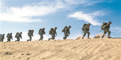 圖為該中隊(duì)官兵在沙漠腹地開展奔襲訓(xùn)練。王國銀 攝