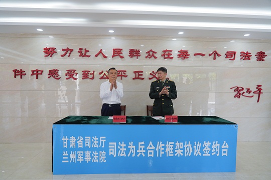 圖為甘肅省司法廳與蘭州軍事法院簽約現(xiàn)場。