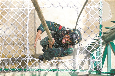 圖①:武警廣西總隊河池支隊特戰(zhàn)隊員進行攀登抓繩上訓練??忧?攝