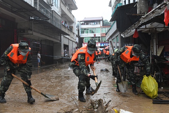 圖為武警官兵齊心協(xié)力清掃街道淤泥。