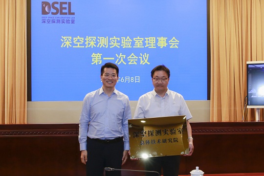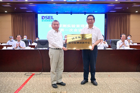 圖為國(guó)家航天局局長(zhǎng)張克儉(左)為深空探測(cè)創(chuàng)新中心授牌。張高翔 攝