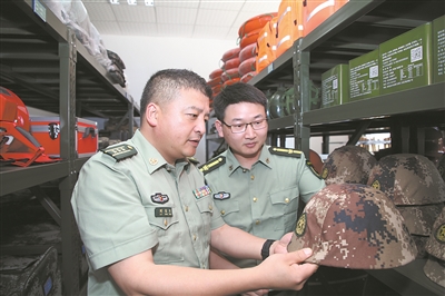 圖為劉東升(左)在檢查人武部戰(zhàn)備物資器材。張榮法 攝