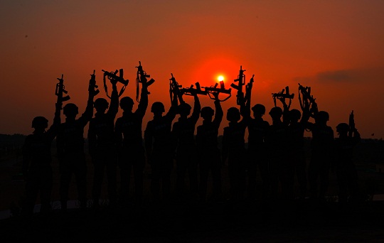 圖為夕陽西下,官兵結(jié)束了一天的訓(xùn)練。