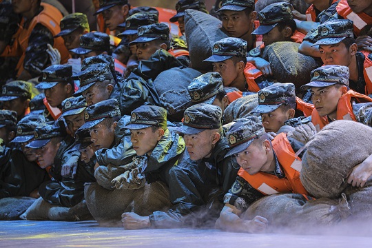 玉樹支隊上士何凱看著舞臺上重現(xiàn)2010年玉樹地震時的場景,手中雙拳緊握,“如果當(dāng)時我動作再快一點(diǎn),一定能救助更多的受災(zāi)群眾?!碑?dāng)年參加抗震救災(zāi)時的新兵如今已是一名13年的老兵。