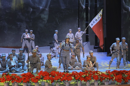 “活著走出草地,不讓一個人掉隊……”情景歌舞《活著走出草地》中的演員們有的頭纏繃帶,有的拄著樹枝拐杖,他們或嚼草根,或啃樹皮,聲情并茂得再現(xiàn)了1934年紅軍萬里長征路上的艱難困苦,詮釋了人民軍隊為救國救民不惜犧牲一切的長征精神。