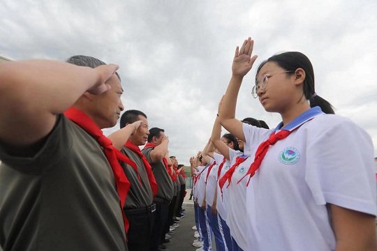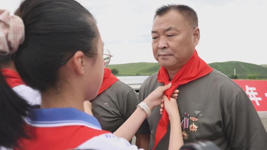 國門之下,革命老兵高舉右拳,神色堅毅,鏗鏘有力的誓言發(fā)自肺腑,“我志愿加入中國共產(chǎn)黨,擁護黨的綱領(lǐng),遵守黨的章程……”一字一句,莊嚴而神圣,面對鮮紅的黨旗,他們?nèi)詧允刂鴰资昵靶臅r的那顆初心,他們把自己的“紅色芳華”,獻給了革命事業(yè)。深受感動的學(xué)生們用最真摯的情感唱響紅歌,用最崇高的敬意為革命老兵戴上紅領(lǐng)巾,革命老兵也回敬標準的軍禮,承載著初心和使命的革命精神跨越時空,根植在學(xué)生們的心中?!皞鞒惺亲詈玫闹戮?,學(xué)生們只有堅守初心,傳承老一輩革命精神,好好學(xué)習(xí),做一個對國家有用的人,才能不負重托、不負期盼?!睘跆m浩特市第五中學(xué)教師王向英表示。