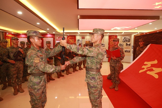 圖為第80集團軍某旅“紅八連”在榮譽室舉行新兵下連授槍儀式。仇成梁 攝