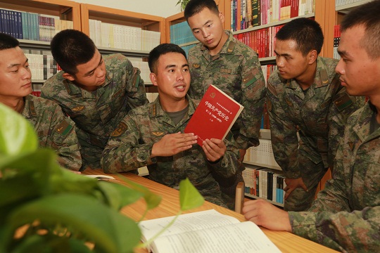 走進“紅八連”,墻上掛的、電子屏播放的都是習近平強軍思想要點;學習室內(nèi)擺放著《習近平強軍思想學習綱要》等書籍,官兵一有時間就來閱讀。政治指導員于鵬說:“在八連,大家都有這樣的危機感,理論學得不好臉上無光,一天不學理論心里發(fā)慌。”