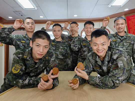 吃著月餅的漁民笑著表示感謝,“感謝你們的付出,正是因?yàn)橛心銈?,我們的日子才更加安穩(wěn)!”