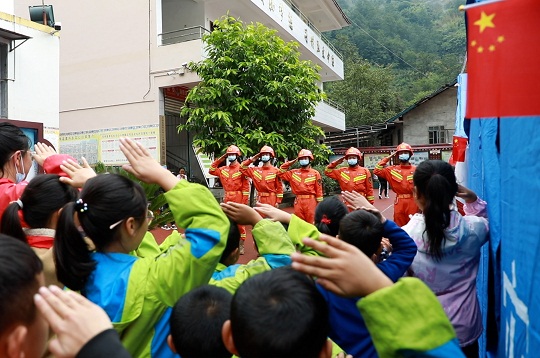 圖為武警涼山支隊(duì)官兵和石棉縣草科藏族鄉(xiāng)小學(xué)學(xué)生們互敬軍禮。