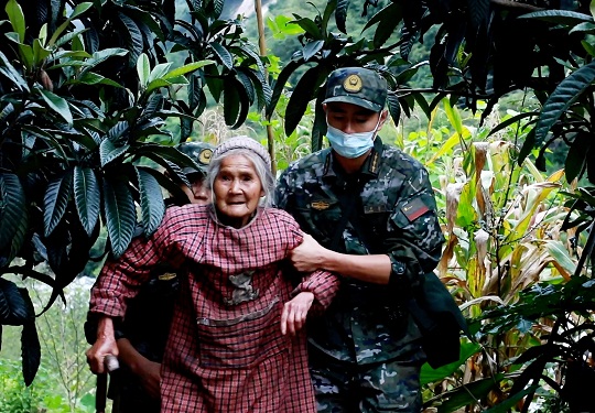 圖為武警官兵在石棉縣草科鄉(xiāng)農(nóng)家村轉(zhuǎn)移受災(zāi)群眾。
