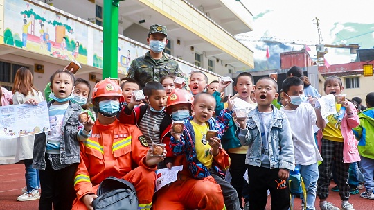 圖為武警涼山支隊(duì)官兵和石棉縣草科藏族鄉(xiāng)小學(xué)學(xué)生們?cè)谝黄稹?/span>