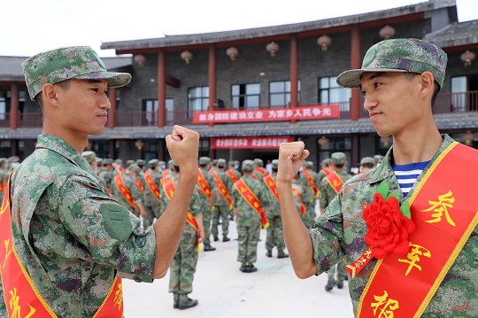圖為即將奔赴軍營的新兵們正在相互加油。